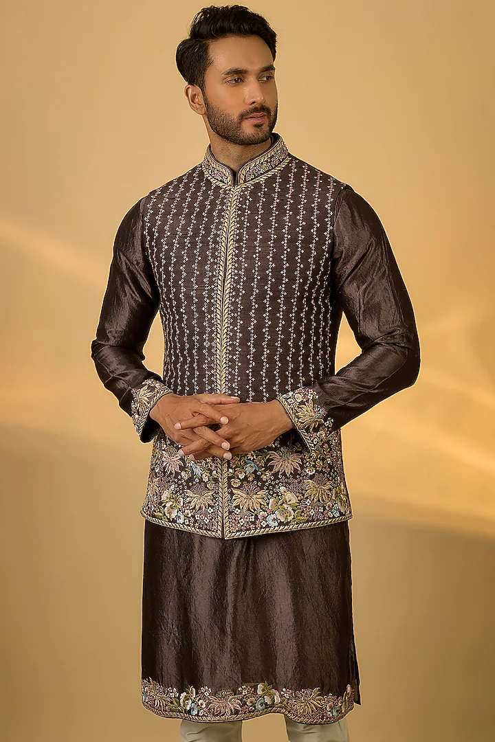 Featuring a brown bundi jacket in raw silk base with parsi gara hand and machine embroidery. It is paired with a kurta and pants. Perfect wear for a wedding, sangeet or engagement ceremony, exuding charm and elegance.
