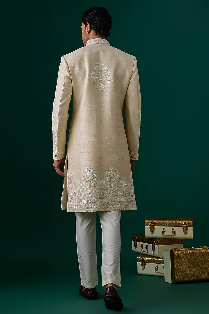 Featuring an ecru sherwani in raw silk base with resham, threadwork, hand and machine embroidery. It is paired with spun cotton pants. Perfect wear for a wedding, sangeet or engagement ceremony, exuding charm and elegance.