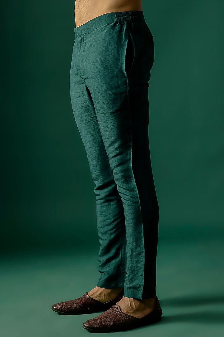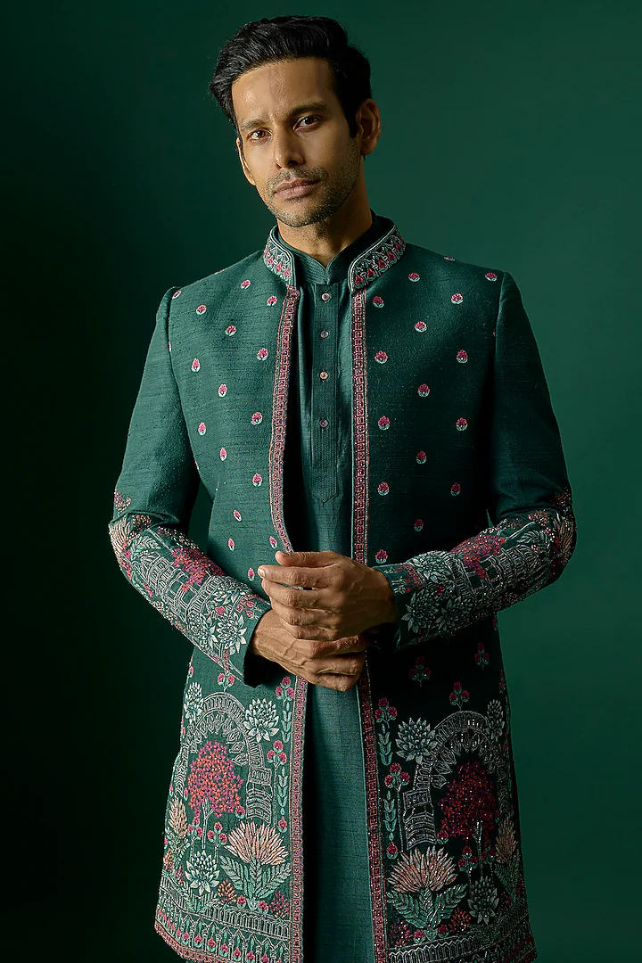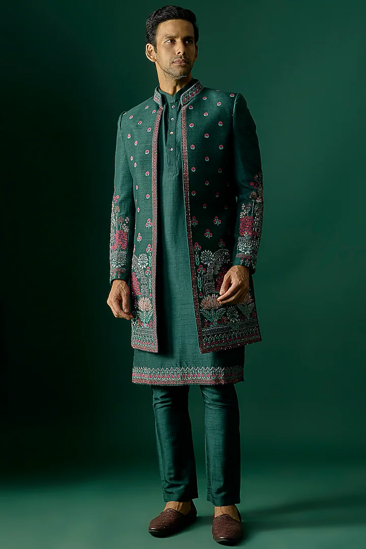 Featuring an emerald green indowestern jacket in silk base. It is paired with a kurta and pants. Style it with loafers for a royal and refined look, perfect for a wedding, engagement or mehendi ceremony.