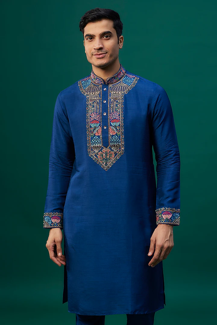 Featuring an indigo kurta in tussar base with threadwork, resham hand and machine embroidery. It is paired with spun cotton pants. Perfect for a wedding or engagement ceremony, exuding traditional charm and elegance.