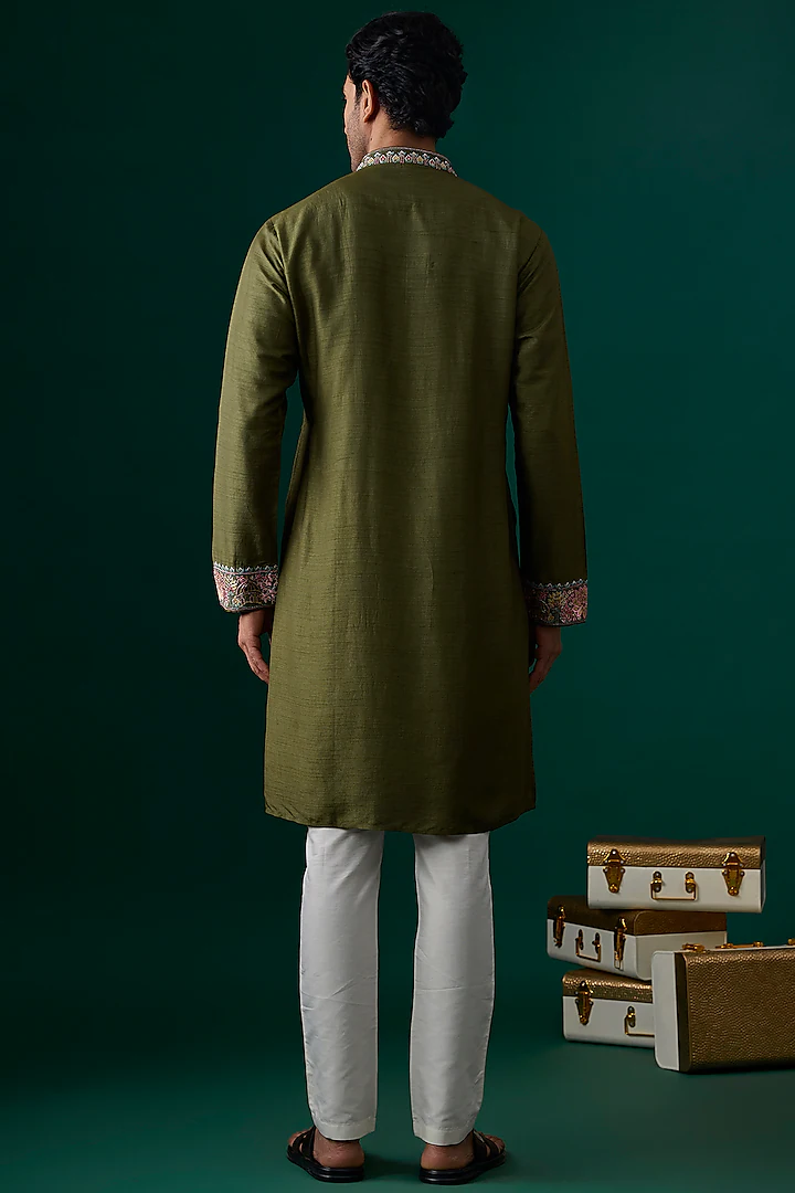 Featuring a mehendi green kurta in silk base with embroidery. It is paired with pants. Style it with a watch and mojaris for a traditional look, Perfect for festive celebrations or mehendi ceremony.
