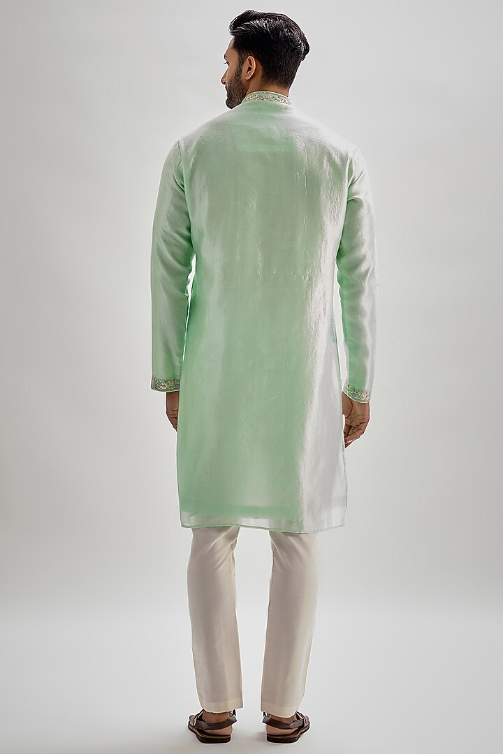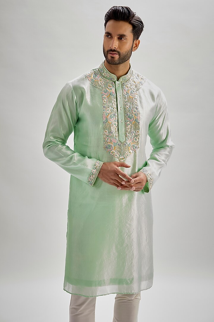 Featuring a mint kurta in silk base with parsi gara hand and machine embroidery. It is paired with spun cotton pants. Perfect attire for a festive occasion, mehendi or engagement ceremony, exuding traditional charm and timeless elegance.