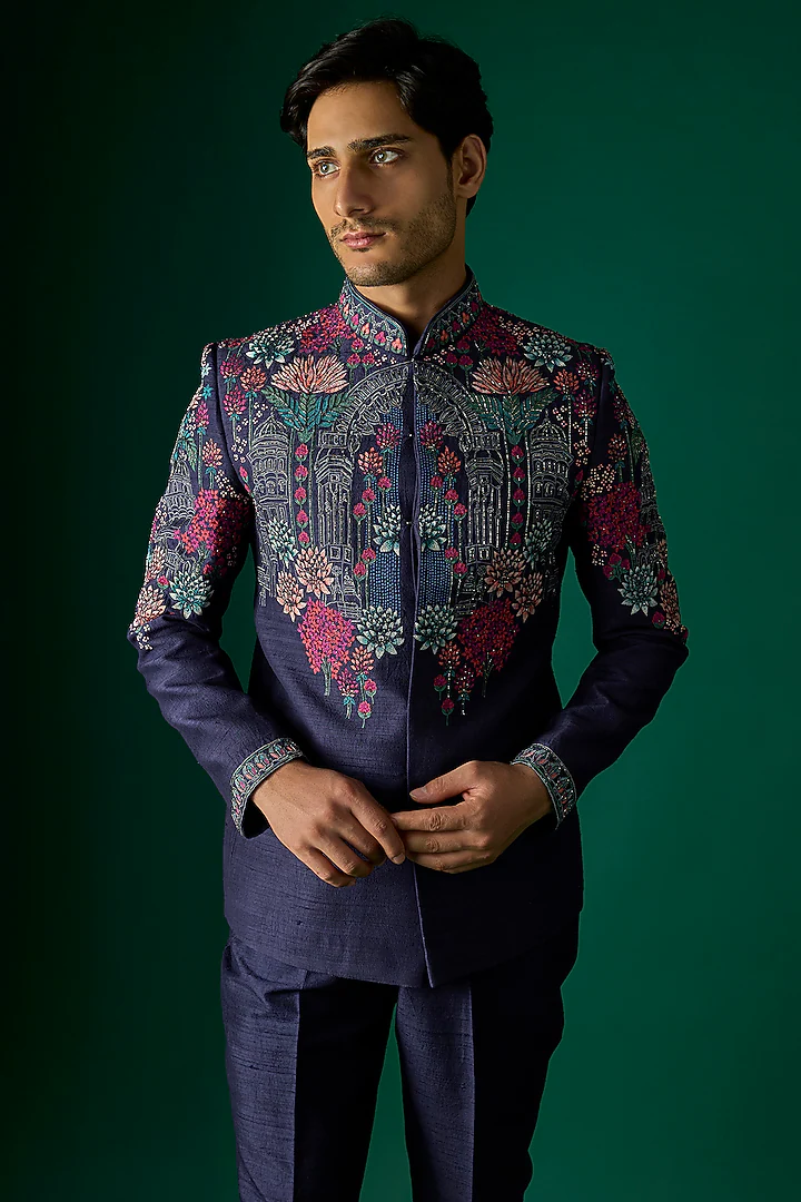Featuring a navy blue bandhgala in silk base. It is paired with pants. Perfect for a wedding, engagement or sangeet ceremony, exuding charm and elegance.