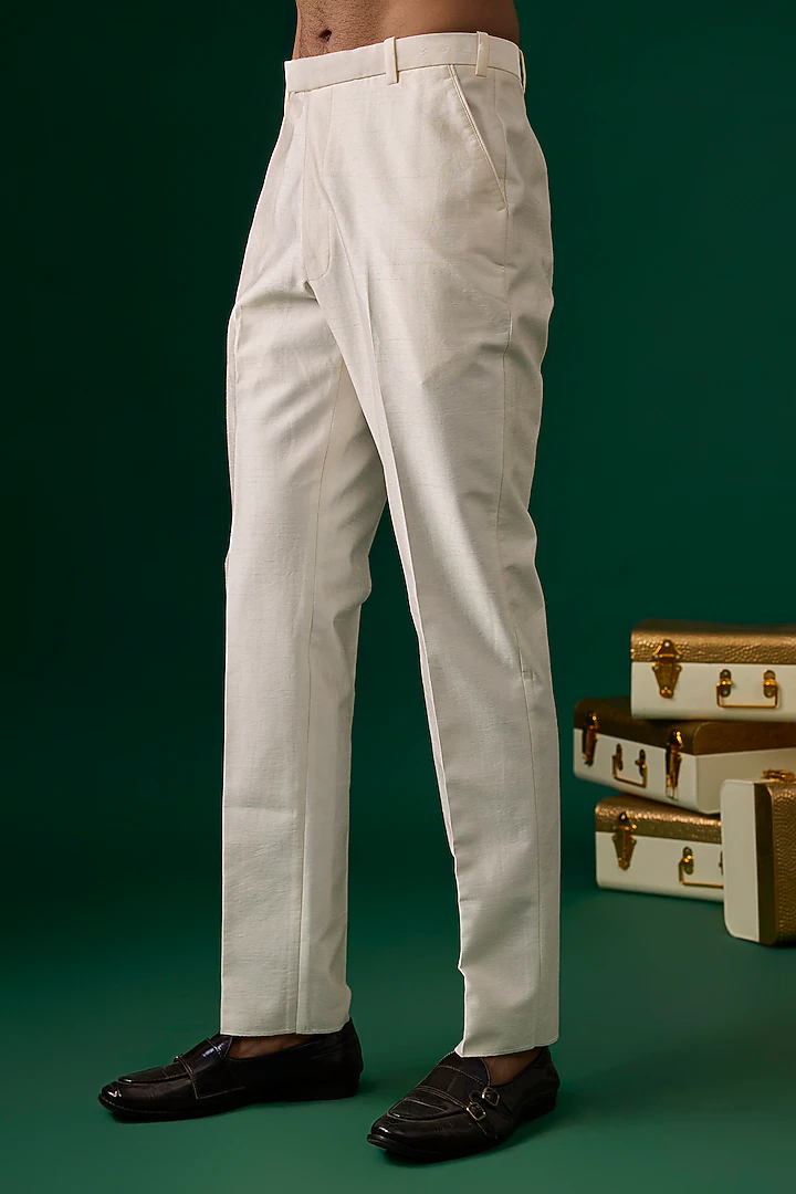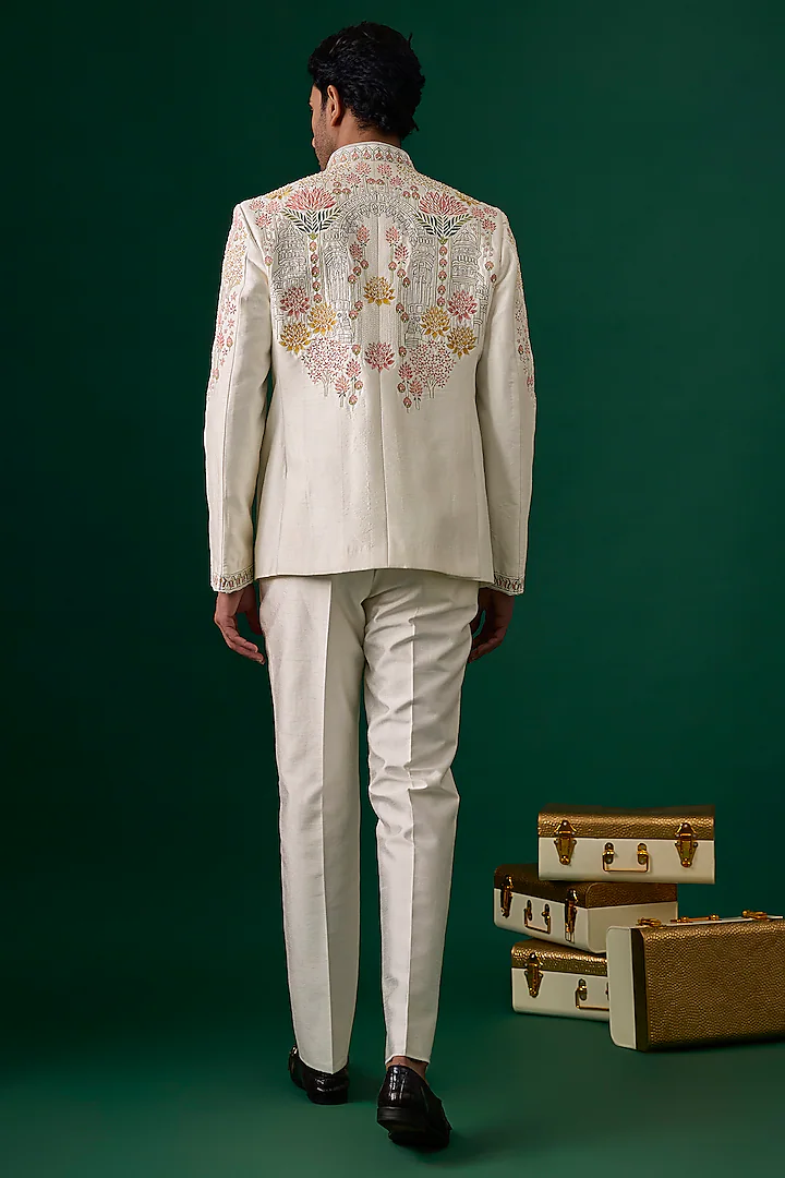 Featuring an off-white bandhgala in raw silk base with threadwork, resham hand and machine embroidery. It is paired with trousers. Perfect attire for a wedding, sangeet or engagement ceremony, exuding traditional charm and timeless elegance.
