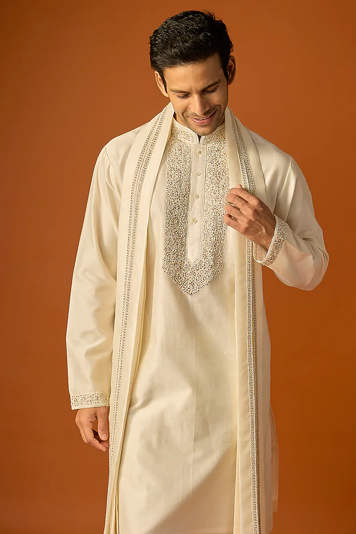 Featuring an off-white kurta in silk base with embroidery. It is paired with pants and a stole. Accentuate it with kolhapuri sandals for a festive occasion, cultural event, mehendi, wedding or engagement ceremony.