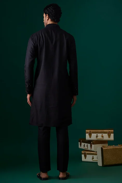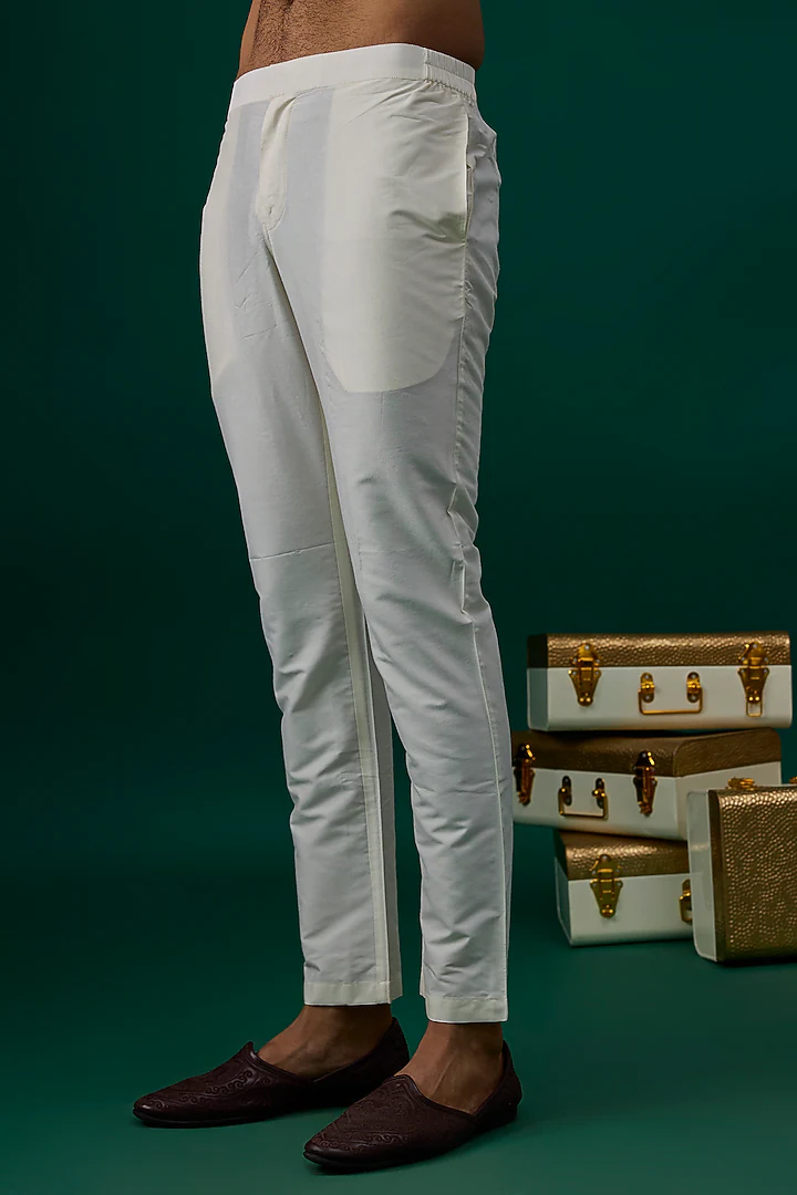 Featuring an off-white kurta in silk base. It is paired with pants. Perfect wear for a festive occasion, wedding or engagement ceremony, exuding charm and elegance.