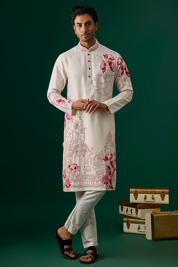 Featuring an off-white kurta in tussar base with resham, threadwork, hand and machine embroidery. It is paired with spun cotton pants. Perfect wear for a festive occasion, wedding or engagement ceremony, exuding charm and elegance.