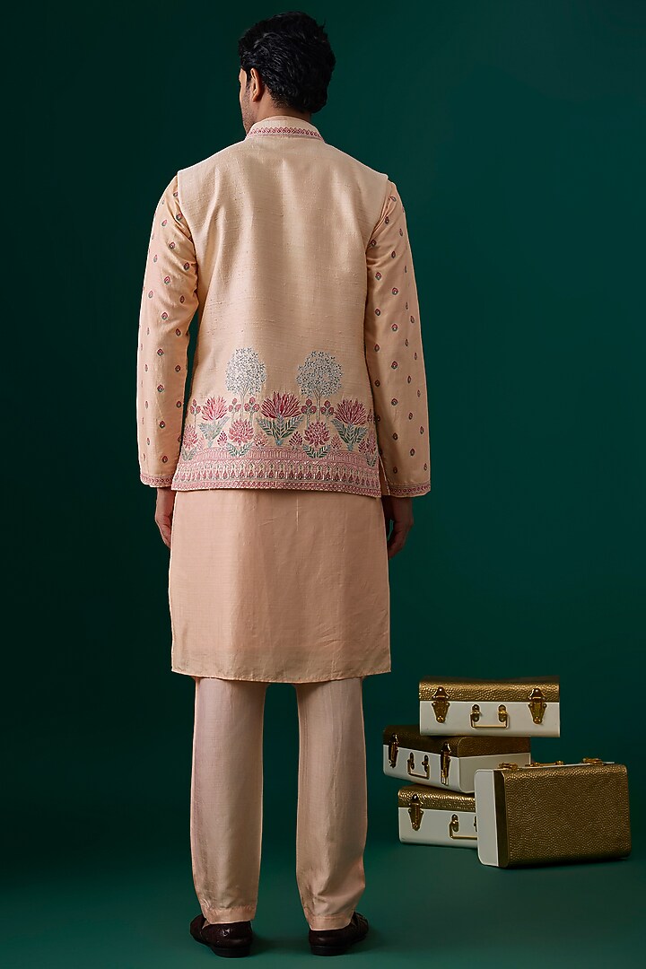 Featuring a peach bundi jacket in raw silk base with threadwork, resham hand and machine embroidery. It is paired with a tussar kurta and spun cotton pants. Perfect wear for a sangeet, wedding or engagement ceremony, exuding charm and elegance.