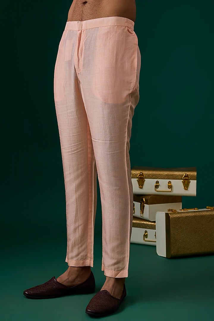 Featuring a peach indowestern jacket in raw silk base with resham, threadwork hand and machine embroidery. It is paired with a tussar kurta and pants. Style it with mojaris for a wedding, sangeet or engagement ceremony, exuding charm and elegance.