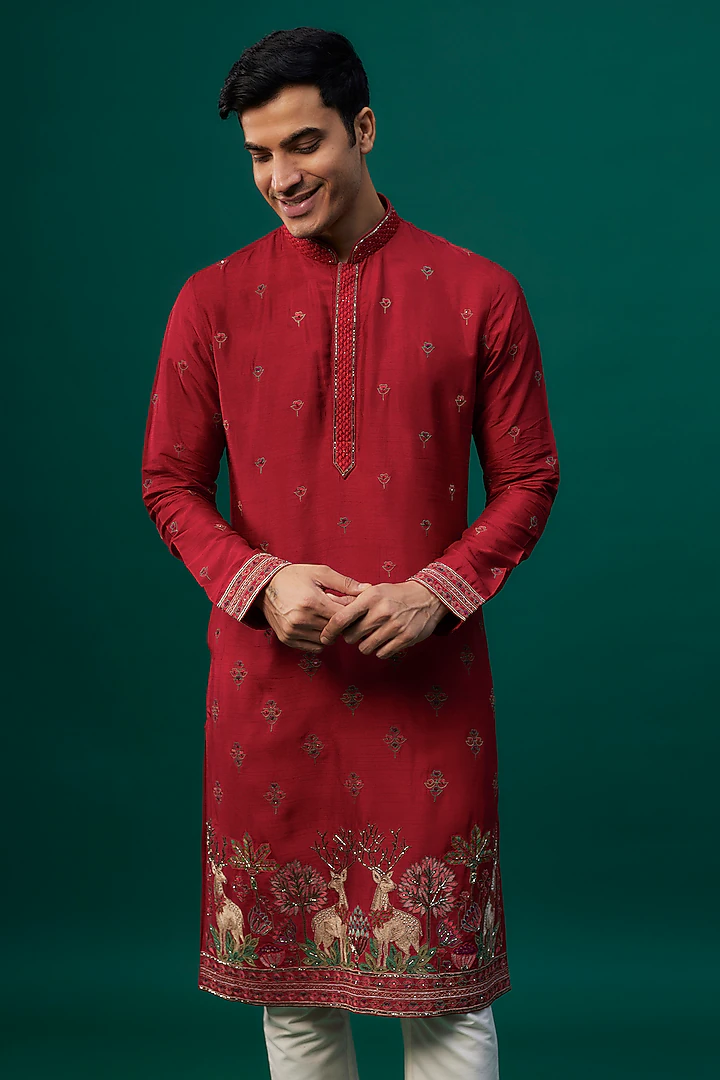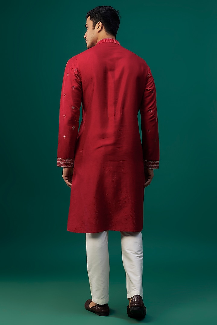 Featuring a red kurta in tussar base with threadwork, resham hand and machine embroidery. It is paired with spun cotton pants. Perfect for a wedding or engagement ceremony, exuding traditional charm and elegance.