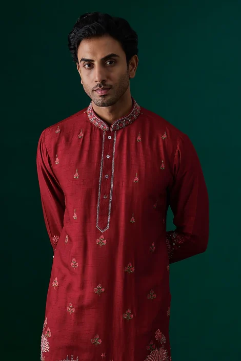 Featuring a yellow kurta in silk base with embroidery. It is paired with pants. Style it with a watch and mojaris for a traditional look, Perfect for festive celebrations or haldi ceremony.